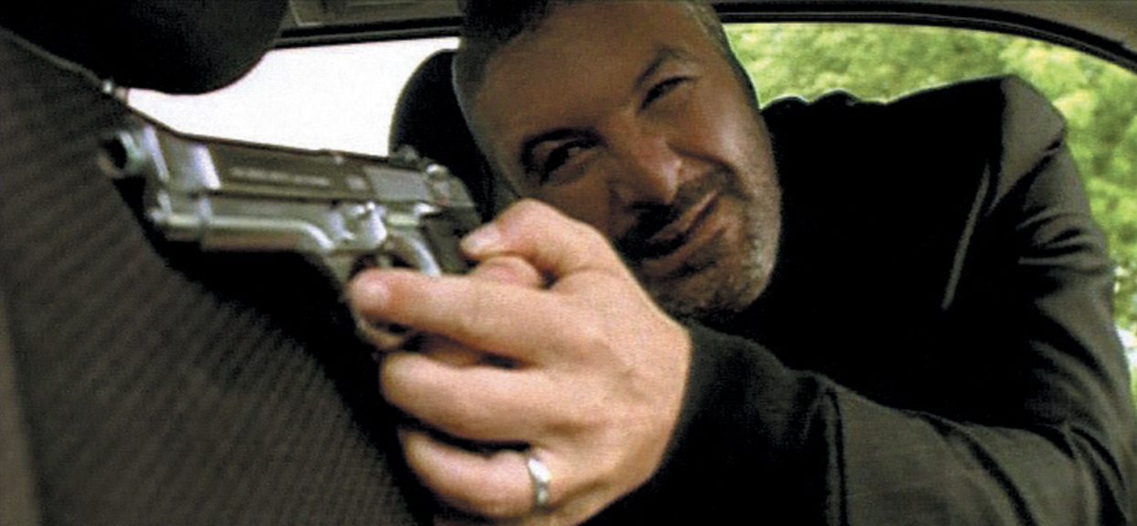 Gun in hand, Bob is rehearsing his part as a burgler.