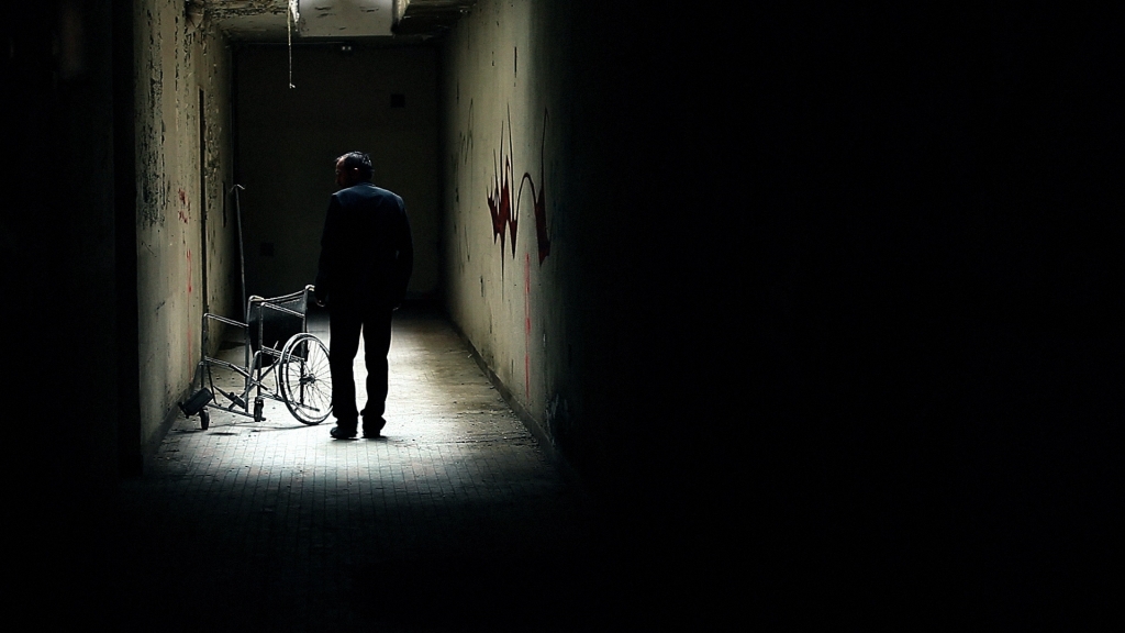 On the top floor of a disused sanitarium, a man regains consciousness after a long coma.