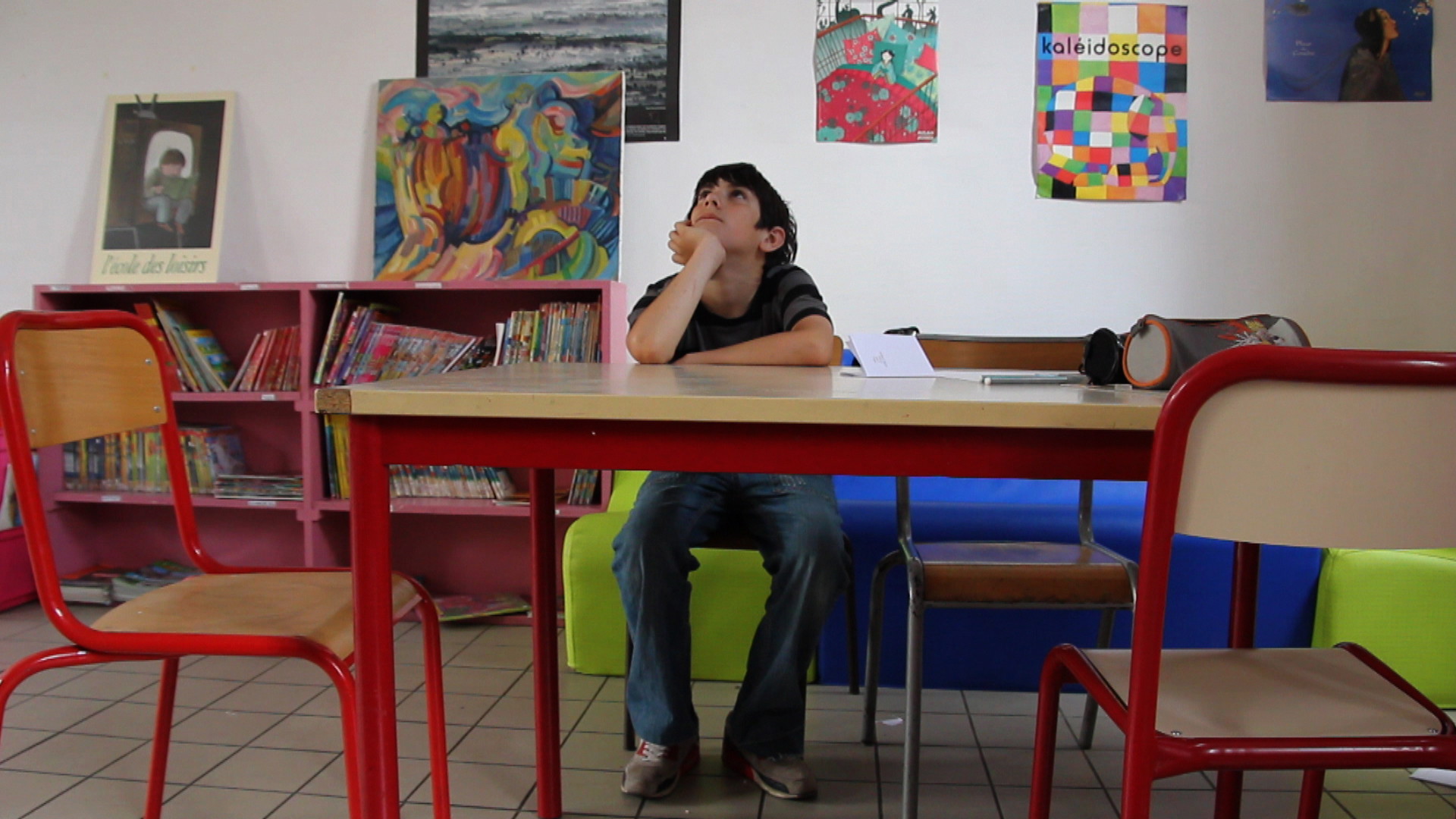 An empty, but inhabited, populated classroom. Ali, Stanislas and Margot speak about books. I am an earthquake expresses one of the titles. Every child interprets and imagines. The story becomes the starting point of a conversation about the world and ones self.