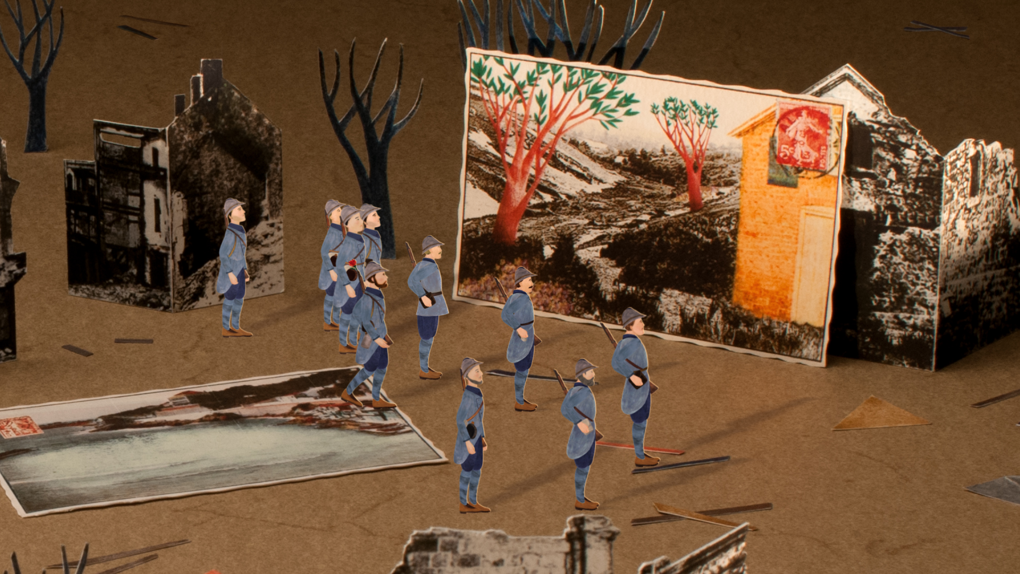 A woman awaits news of her loved one, who has gone off to the war. She pictures her life up until the arrival of a postcard.