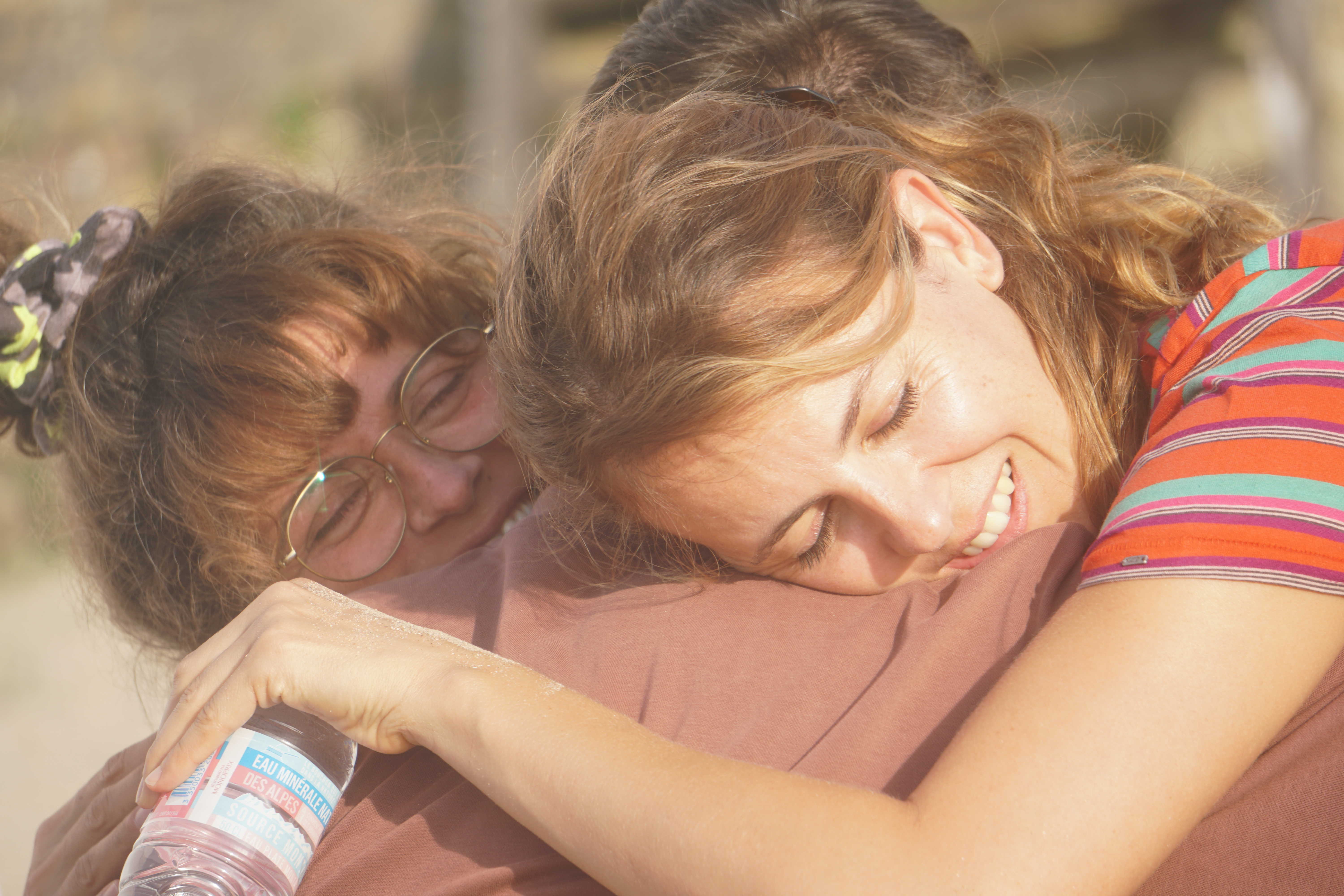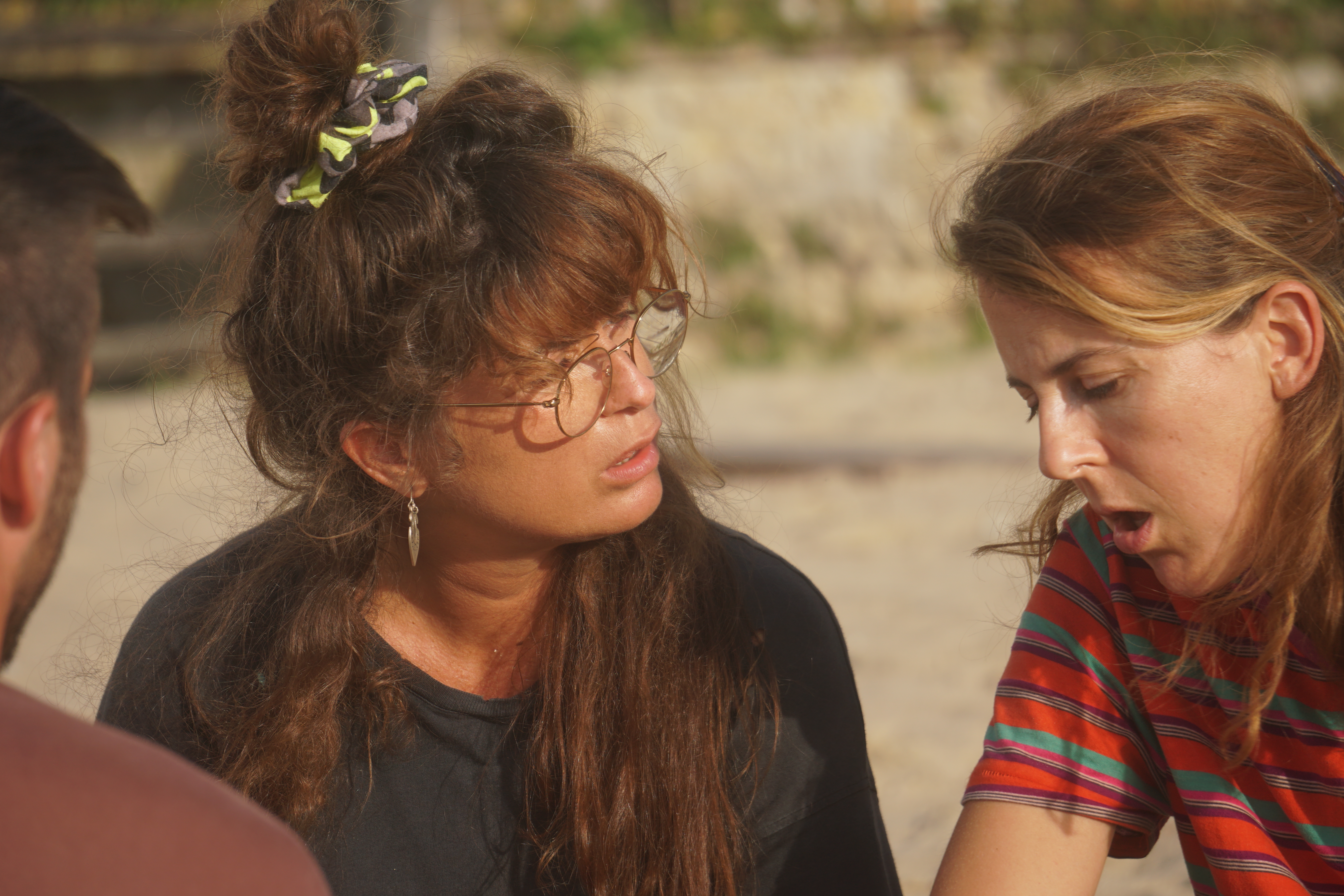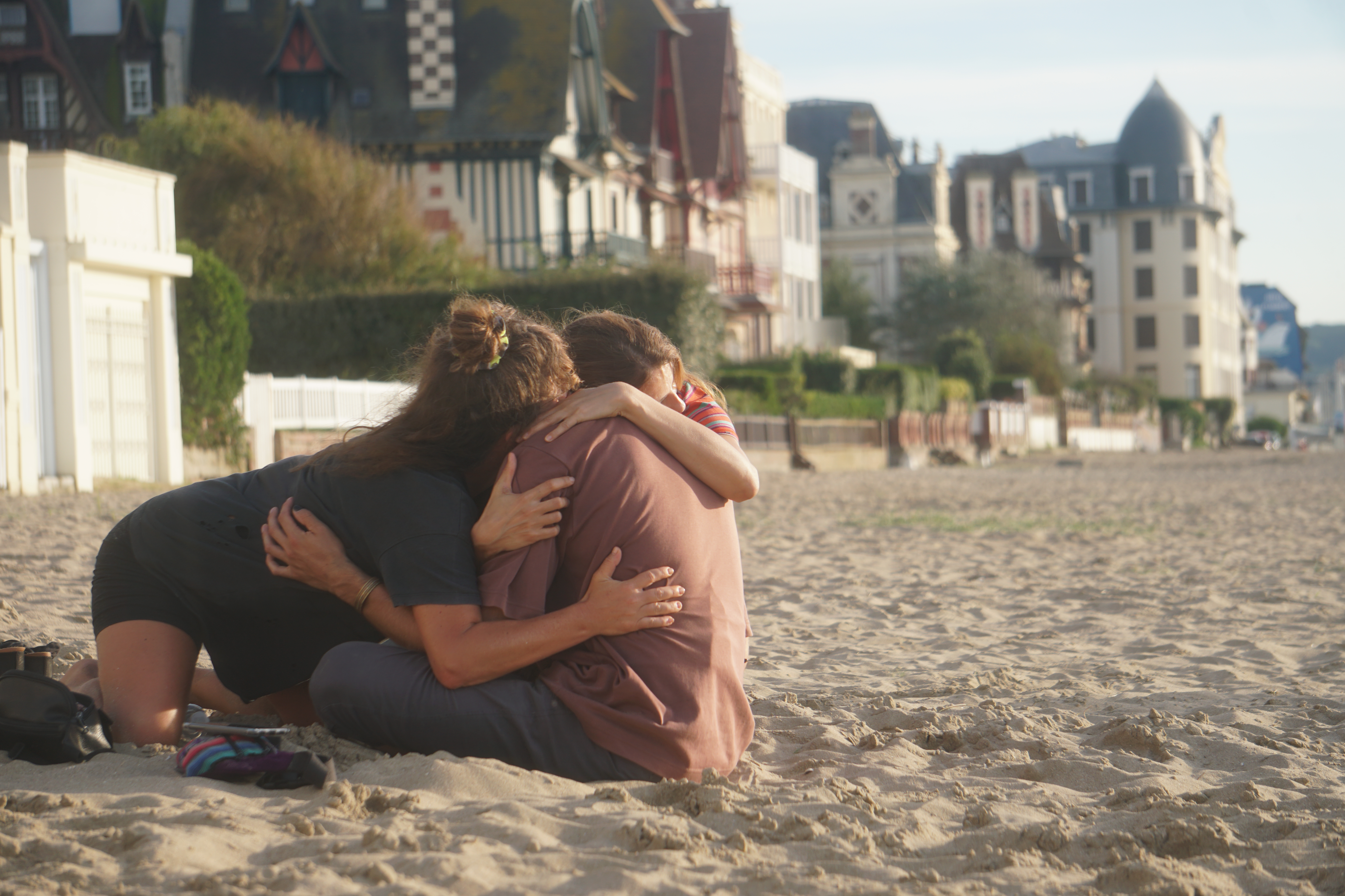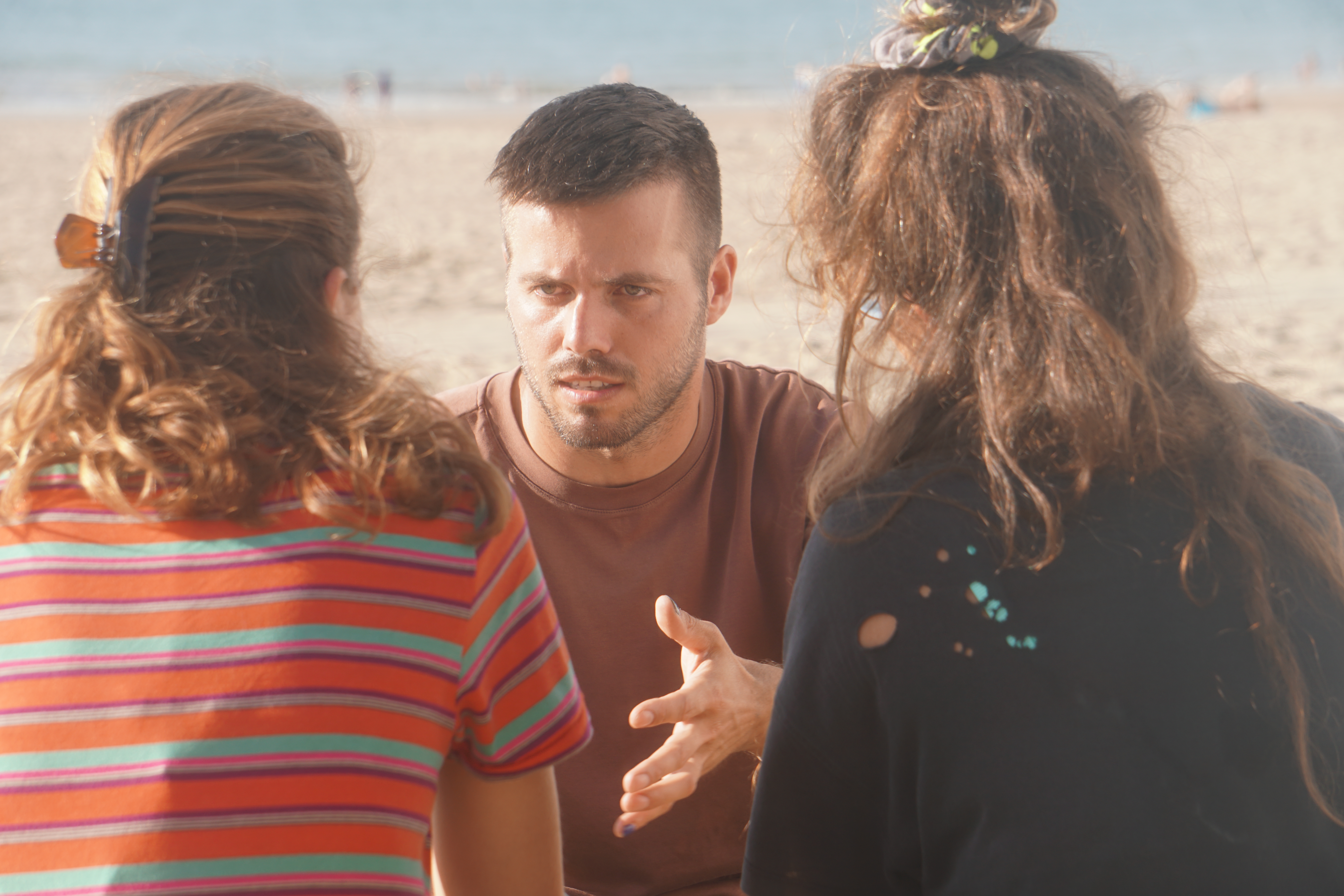 Three friends are sitting on a beach, practicing for a coming out.